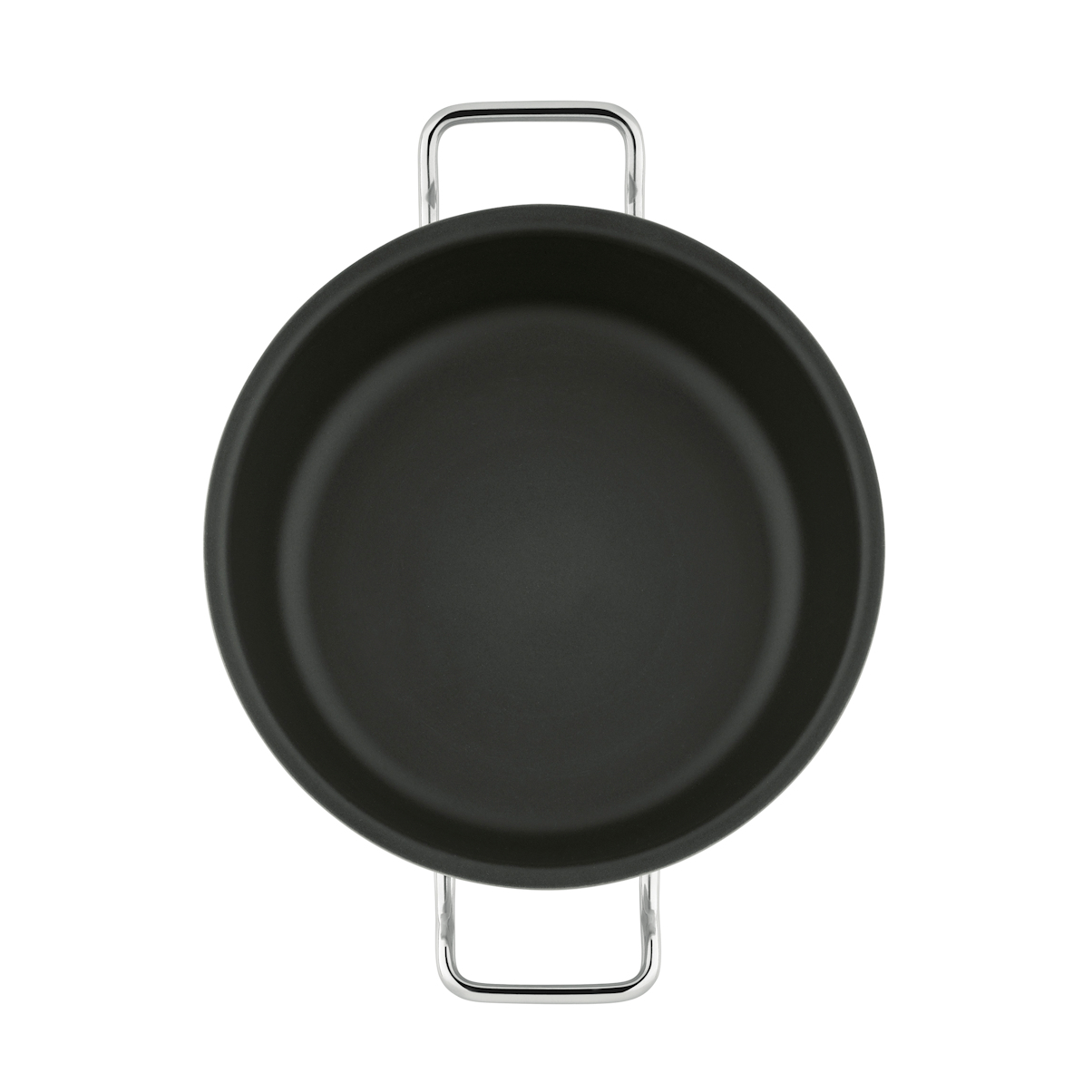 Niet onbelangrijk, de slijtvastheid is gelijk aan een RVS koekenpan. Uiteraard kun je er kleine krasjes of gebruikssporen in gaan zien, maar die zijn dan oppervlakkig en hebben verder geen enkele invloed op de werking. Er kan ook nooit iets “los komen” uit de pan, het oppervlak is en blijft zoals het is en is daarmee uitermate krasvast.
